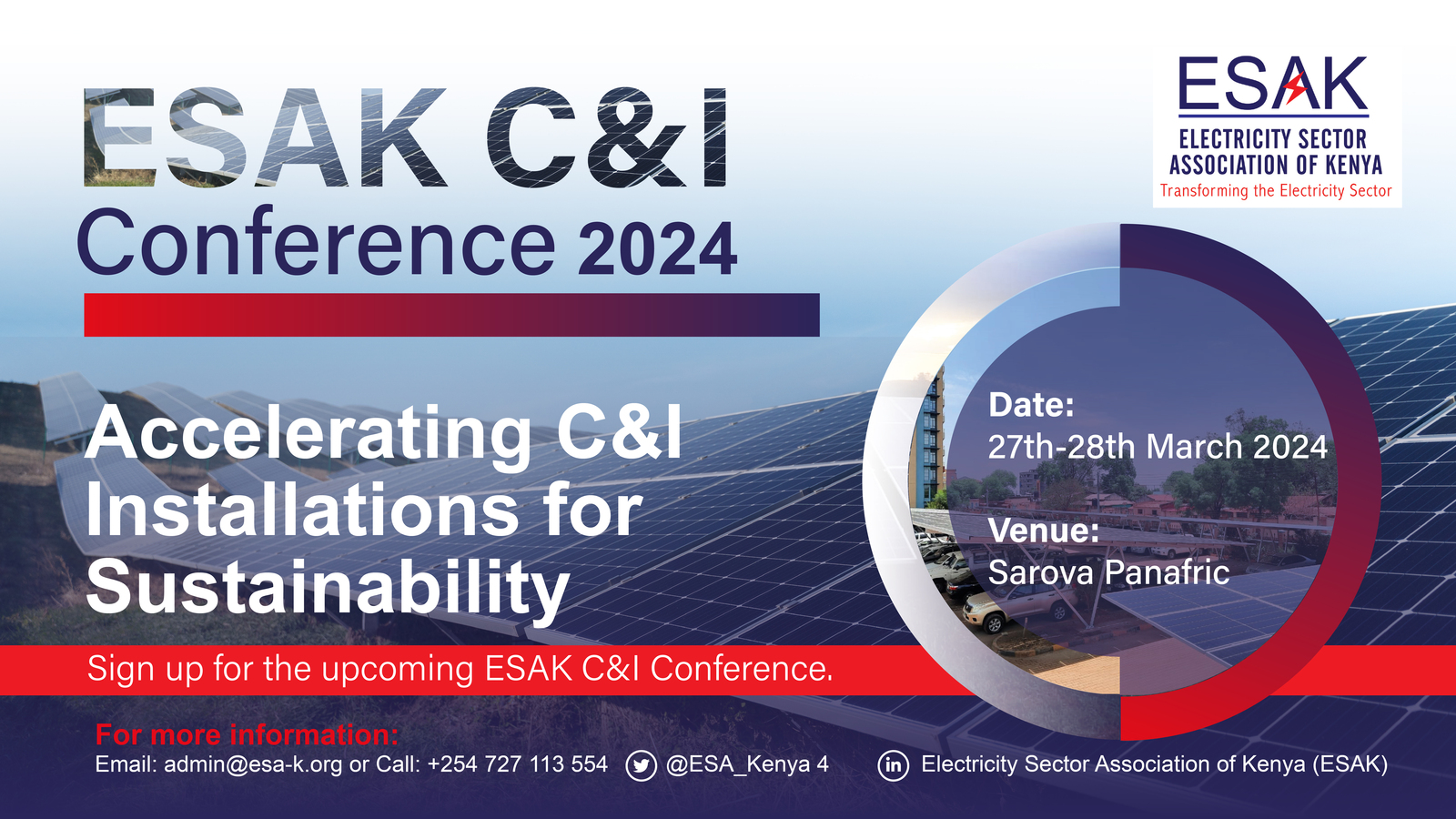 alarmclock Conference is coming! Days Hours Minutes A two-day conference and exhibition by the Electricity Sector Association of Kenya (ESAK) and partners in generation, transmission and distribution in the Commercial and Industrial (C&I) sector.Register your interest today! Book a Seat Our Conference Partners Focus Areas Financing Solutions Matchmaking Access C&I Experts C&I Solutions